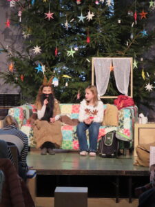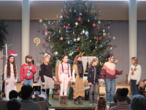 Das Highlight stand am Ende des Abends auf dem Programm. Die Theater-AG, unter Leitung von Frau Baumann, präsentierte das Stück „Weihnachtsfieber“, das unser Chor unter der Leitung von Frau Rudel musikalisch mitgestaltete. Das war ein voller Erfolg!