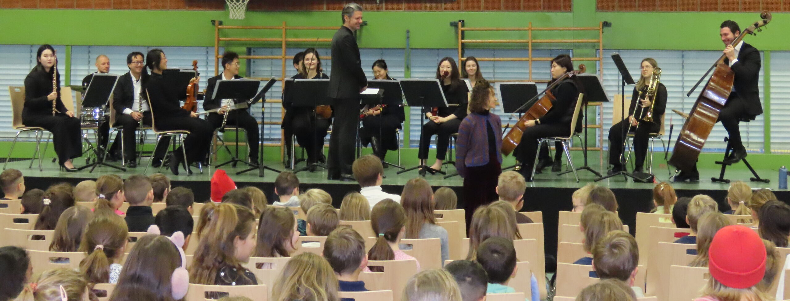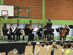 Mit großen Augen liefen die Schülerinnen und Schüler der Grundschule am Donnerstag, den 18.12.25, in unsere Turnhalle. Dort war nämlich bereits eine Bühne aufgebaut, auf der zahlreiche Musikerinnen und Musiker gerade ihre Instrumente einspielten. Von einem riesigen Kontrabass über die Flöten bis hin zu den Blechbläsern waren beinahe alle Instrumente eines Orchesters vertreten.